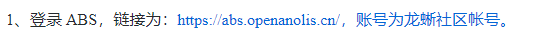 1. 【文档链接】 > https://openanolis.cn/sig/Cloud-Kernel/doc/721476435931824255 2. 【有问题的文档内容】 > https://abs.openanolis.cn/,账号为龙蜥社区帐号。 >  3. 【文档存在的问题】 > 点击跳转时,链接出现汉字 4. 【预期结果】 - https://abs.openanolis.cn/